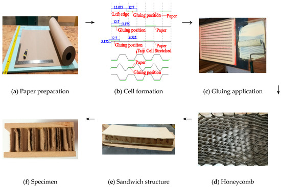 Kraft paper as presented in Figure 2a, was first cut to a size of 508 × 635 mm. Then 12.7 mm width of gluing strips were positioned periodically as presented in Figure 2b with distances of 28.575 mm (3 × 9.525 mm) along the paper edge. After PVAc glue was applied on the designated position of the papers (Figure 3c), three paper pieces were stacked with sequences with offset distance to the edge of −3.175 mm, 0 and 15.875 mm, respectively, and then repeated until up to 48 layers. After that, the stacked paper was pressed under 0.5 MPa for 4 h. According to specific experiment measurements, stacked papers were sliced vertically to strips of 15.875 mm, 25.4 mm and 34.925 mm. The honeycomb strips were stretched and fixed under temperature 85 °C for 10 min. Then sandwich panel was assembled manually by bonding wooden face sheets (MDF and PLY) to a paper honeycomb core, using room-temperature-curing glue of 240 g/m2. After that, a compression load of 0.1 MPa was applied on those sandwich beams and kept for 4 h to form strong internal strength of composite. To minimize the size effect of the honeycomb structure, all specimens were cut to the width of 58 mm (Figure 2d–f).