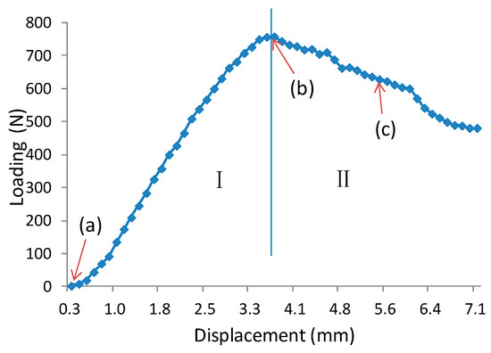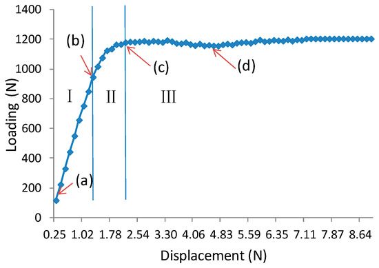 Typical load-displacement curve of indentation process of wooden sandwich beam with Taiji honeycomb core (A1B3C3): (a) unloaded; (b) initiation of indentation; (c) showing condition after indentation.