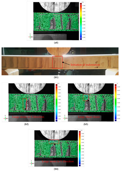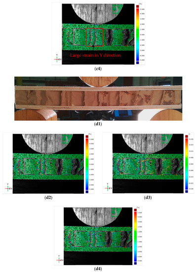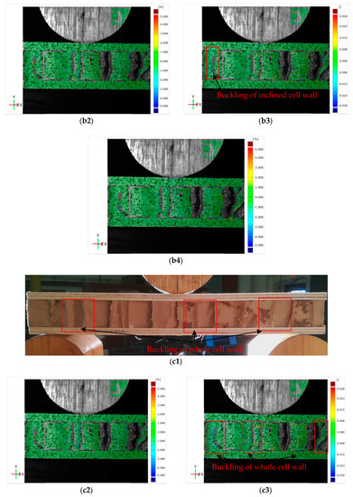 Photographs and strain distribution of core shear failure process of wooden sandwich beam with Taiji honeycomb core: a1 for photograph, a2 for , a3 for and a4 for under unloaded condition; b1 for photograph, b2 for , b3 for and b4 for under buckling of inclined cell wall; c1 for photograph, c2 for , c3 for and c4 for under buckling of whole cell wall; d1 for photograph, d2 for , d3 for and d4 for under post-buckling stage.