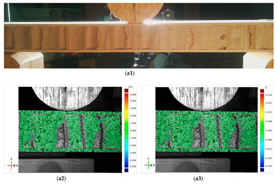 To identify as many failure modes as possible, specimen combinations of various face sheets and core thickness were tested under a three-point bending. The experiments performed are presented in Table 3, and all of them were carried out using a universal testing machine (MTS systems) in displacement control, setting the crosshead speed according to Equation (1). The diameter of the cross head was 76.2 mm. Span distances were varied in a range between 76.2 mm to 381 mm to assess the independence of the critical loading on it. Recently, digital image correlation method was applied to precisely observe the deformation and failure process of wood-based materials [24,25,26], so this method was also involved in this paper to measure strain distribution close to the loading roller.