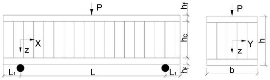 As mentioned in the literature, the most common failure patterns for sandwich beams are shear failure, indentation and face yield. In this section, analytical models were used to predict the strength of the sandwich beam with Taiji honeycomb core, under a three-point bending test. The specimen considered in the analysis is graphically represented in Figure 7, which consisted of a sandwich beam of span length L and width b. The specimen has two identical face-sheets of thickness and a paper honeycomb core of thickness . The model’s results will be compared with experimental data.