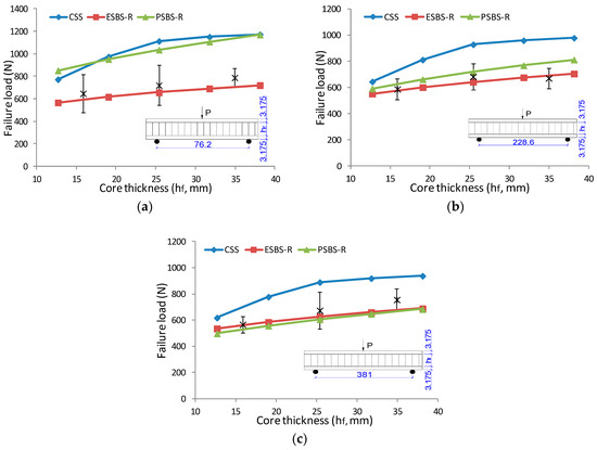 The effect of core thickness on failure load under a three-point bending test: (a) Sandwich beam with 3.175 mm MDF face under span of 76.2 mm; (b) sandwich beam with 3.175 mm MDF face under span of 228.6; (c) sandwich beam with 3.175 MDF face under span of 381 mm.