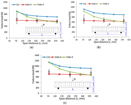 The effect of span distance on failure load under three-point bending: (a) Sandwich beam with 3.175 mm MDF face and 15.875 mm core; (b) sandwich beam with 3.175 mm MDF face and 25.4 mm core; (c) sandwich beam with 3.175 mm MDF face and 34.925 mm core.