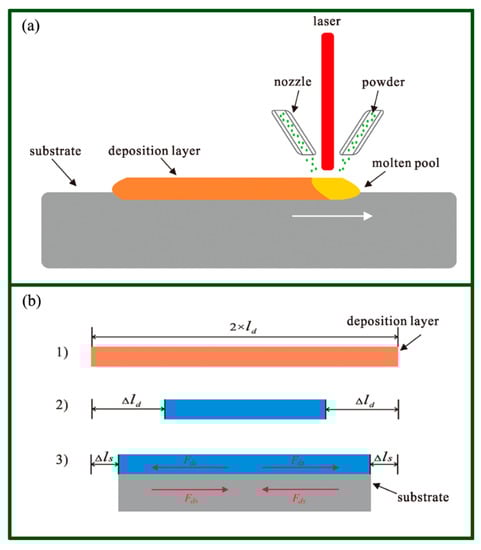 Figure 1a illustrates the laser converging on the substrate; this melted the substrate and the incoming powder, forming a molten pool. After the laser was removed, the molten pool cooled and solidified, forming a one-track deposition. The molten pool shrunk due to the temperature decline after the laser was removed. The deposited metal all underwent the same melting-cooling process in the single track LMD, so the deposited track was assumed to shrink uniformly. In Figure 1b, ld represents half the length of the deposited track at a high temperature. Δld is half the shrinkage of the deposited track at low temperature if there was no constraint. Nevertheless, the substrate at room temperature showed a little shrinkage. As a result, a balanced distribution of deformation was generated between the deposited track and the substrate. The deposited track was stretched by the substrate, while the substrate was compressed by the deposited track. Thus, the half shrinkage of the deposited track Δld could be restricted to Δls due to the substrate constraint. The interaction force along the longitudinal direction between the deposited track and the substrate was assumed to be Fds.