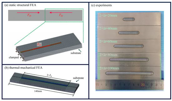 The three methods used in this study. (a) Static structural finite element analysis (FEA) model (half of the substrate). (b) Thermal-mechanical FEA model. (c) Single track samples with various deposition lengths.