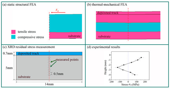 The distribution of stresses σxx fouind via the three methods. (a) The stress distribution in the static structural FEA model (half of the substrate). (b) The distribution of residual stresses in the thermal-mechanical FEA model. (c) The measured points of XRD residual stresses tests. (d) The experimental residual stresses along the center line.