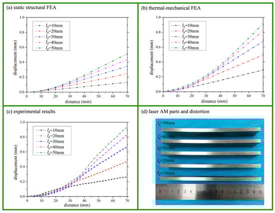 As distortion was symmetrical, the Z-direction displacement of the half substrate along the length was extracted from the models and measured in experiments. Figure 5 depicts the displacement curves for various ld values using the above three methods. Figure 5a follows the same trends as those depicted in Figure 5b–d. We concluded that a longer deposition length ld leads to a more obvious distortion along with larger peak displacement. Examining the distribution of stresses allows a better understanding of this phenomenon. The tensile stress at the lower section of the substrate resulted in tensile strain while the compressive stress at the upper section of the substrate led to compressive strain. Thus, a bending angle occurred in the substrate. When the deposition length ld was increased, the bending angle accumulated and hence became larger. Therefore, the peak displacement rose, as depicted in Figure 5.