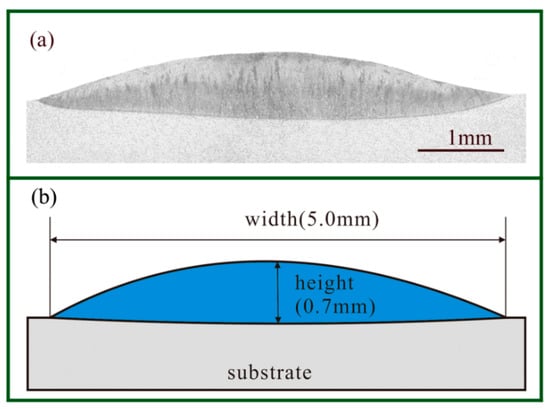 The cross-section of the deposited layer: (a) A metallographic microscope image and (b) a schematic diagram.