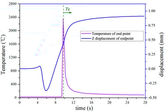 The above studies showed that the distortion is likely to be caused by the constraining force Fds. Equation (1) shows that the constraining force Fds is related to material properties, temperature, and cross-sectional area. The experiment only used AISI 316L stainless steel, so changes in material properties are not discussed here. In order to investigate the relationship between distortion and temperature, the changes in temperature and distortion over time were extracted from one-track thermal-mechanical FEA model with a deposition length ld of 50 mm, as shown in Figure 7. The temperature of the end point on the top surface of the deposited track is adopted as a representation. The results demonstrate that the free end of the substrate was distorted downward, due to the thermal expansion of the laser heated zone. After the LMD was completed, the deposited track gradually contracted, causing the free end of the substrate to bend upward. It is worth noting that the positive displacement of the free end increased linearly with decreasing end point temperature from the time Tc on, where Tc means the beginning of cooling. The figure also shows that the temperature difference ∆T rarely changed after deposited track was cooled below about 200 °C. During the same period, the displacement displayed a little change. The above study revealed the relevance of distortion and temperature, especially in terms of the linear relationship between them during the cooling process. Denlinger [19] also concluded that changes in the temperature were correlated with observed distortion in experiments. Therefore, the relationship between distortion and temperature is partly verified.