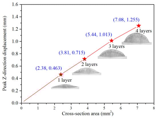 To further validate the relationship between distortion and cross-sectional area, an experiment involving different layers of deposition was performed. Based on the same processing parameters as for the single-track deposition, the laser head was elevated by 0.7 mm layer by layer. A dwell time of 120 s between layers was applied to diminish the disturbance caused by heat accumulation. Figure 8 shows the peak Z-direction displacement and the cross-section area of various layers with ld of 20 mm. The distortion was enhanced as the metal was added layer by layer. The results also showed a distinct linear relationship between distortion and cross-sectional area, which also verified Equation (1).