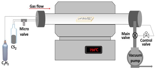 As a catalyst for the formation of CF-CMC hybrid materials, approximately 0.01 g of Ni powder (99.7%), with particle diameters ranging from 0.5 to 5 μm, was spread onto the prepared CFs on a 2-mm-thick aluminum substrate. A thermal chemical vapor deposition (TCVD) system was employed for the formation of CF-CMC hybrid materials, using C2H2 as the source gas and CS2 as the additive gas (Figure 1). A glass tube equipped with a microvalve was designed and installed at the front part of a reactor, as shown in Figure 1. In this glass tube, liquid-state CS2 at room temperature was converted into gaseous CS2 in a vacuum. It was then accurately injected into the reactor using the precisely controlled microvalve.