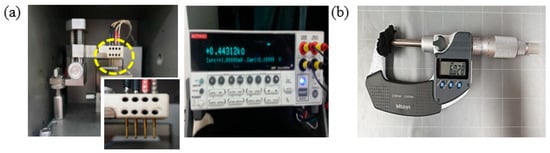 The resistivity values of the samples were measured using a four-point probe (labsysstc-400, Nextron) connected with a multi-meter (Keithley 2400, OH, USA), using Ohm’s law and a correction factor at room temperature (Figure 3a) [15]. The thickness of the samples was investigated using the micro-meter (Mitutoyo 406-250-30, Kawasaki, Japan) as shown in Figure 3b and verified by the cross-sectional images of FESEM.