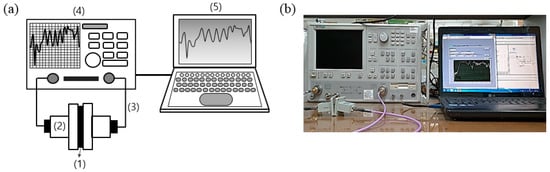 Figure 4. (a) Schematic diagram of the vector network analyzer: (1) sample; (2) wave-guide test holders (90WECAS); (3) coaxial cables (18.5 GHz, CM06A); (4) vector network analyzer (VNA); and (5) computer and (b) optical photograph of the experiment setup for electromagnetic interference (EMI) shielding measurement.