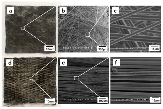 Figure 5. Top: (a) photograph; (b) Field-emission scanning electron microscopy (FESEM) image; and (c) magnified FESEM image of the nonwoven fabric. Bottom: (d) optical photograph; (e) FESEM image; and (f) magnified FESEM image of the woven fabric.