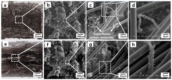 After the CF-CMC hybrid formation reaction using the TCVD system, the surface morphologies of the CF-CMC hybrids in the nonwoven and woven fabrics were examined, and the imaging results are shown in Figure 7. In both cases, the CF-CMC hybrids were successfully formed. The diameters and the coil pitch dimensions of CMC in the woven fabric seemed to be larger than those in the nonwoven fabric (Figure 7d vs. Figure 7h).