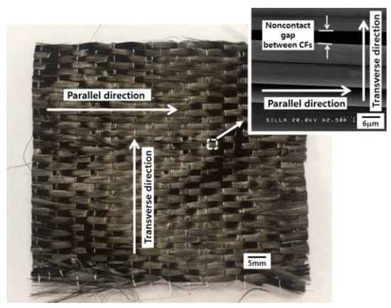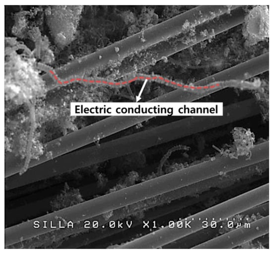 In the case of the woven fabric, the variation of the resistivity induced by the CF-CMC hybrid formation reaction depended on the measuring direction. The resistivity for the transverse and parallel directions to the individual CFs was shown to be much different as shown in Table 2. This remarkable difference appeared to be owing to the characteristics of the woven fabric. Namely, the direction transverse to individual CFs features noncontact gaps between CFs (Figure 9, inset), which increases the fabric’s resistivity. After the CF-CMC hybrid formation reaction, the resistivity in the direction transverse to individual CFs decreased. The mechanism underlying this electrical conductivity improvement appeared to be the formation of inter-contacts by CMCs in the noncontact gaps between CFs. As in the previous report, the electron-conducting channels in the direction transverse to individual CFs appeared to form by the formation of CMCs among CFs (Figure 10) [17]. Therefore, the created electron-conducting channels may increase the electron conductivity in the direction transverse to individual CFs. For the direction parallel to individual CFs in the woven fabric, the resistivity seemed to be slightly increased. The direction parallel to individual CFs already features continuous connecting CFs. After the CF-CMC hybrid formation reaction, therefore, the electrical conductivity in the direction parallel to individual CFs appeared to be reduced, owing to the formation of superfluous carbon materials in the woven fabric, similar to the nonwoven case.