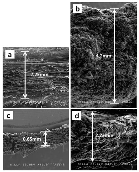 Figure 11. FESEM image, showing the cross-sections of (a) the nonwoven fabric; (b) the nonwoven fabric after the CF-CMC hybrid reaction; (c) the woven fabric; and (d) the woven fabric after the CF-CMC hybrid reaction.