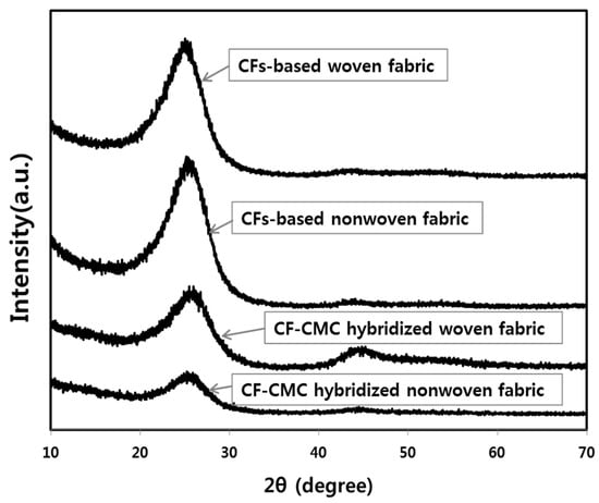 Figure 12. X-ray diffraction (XRD) spectra of the CF-based nonwoven and woven fabrics, and the spectra of their corresponding CF-CMC hybrids.
