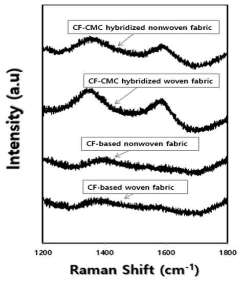 Figure 13. Raman spectra of the CF-based nonwoven and woven fabrics, and the spectra of their corresponding CF-CMC hybrids.