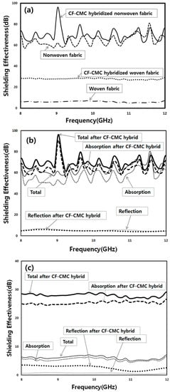 As shown in Figure 14c, the increase in the SE of the CF-CMC hybridized woven fabric was more than twofold throughout the entire range of operating frequencies. This dramatic increase in the SE value of the CF-CMC hybridized woven fabric seemed to be mainly ascribed to the enhanced electrical conductivity, particularly in the direction transverse to individual CFs (from (0.82 ± 0.14) × 10 S/m to (1.82 ± 0.20) × 102 S/m) following the CF-CMC hybrid formation (Table 2).In addition, as in the case of the nonwoven fabric, the thickness of the woven fabric was significantly increased by the CF-CMC hybrid formation (Table 2, thickness of the woven fabric (0.56 ± 0.04 mm) vs. that of the CF-CMC hybridized woven fabric (2.77 ± 0.34 mm). Furthermore, the intrinsic characteristics of CMCs in the CF-CMC hybridized woven fabric can enhance the absorption loss of EM waves at high operating frequencies. Consequently, the SE values of the CF-CMC hybridized woven fabric can be significantly improved by the SE absorption mechanism, owing to the increase in its thickness and electrical conductivity and owing to the intrinsic characteristics of CMCs.