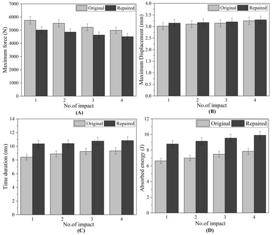 Comparative study of maximum displacement achieved by the multi-impacted original and repaired samples was carried out. The percentage of the maximum displacement variation with respect to the original samples at first, second, third and fourth impacts were calculated as −4.31, −2.25, −1.92 and −1.23%, respectively. The increasing order of the displacement per impact demonstrated the energy absorption.
