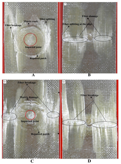 Visual inspection technique is one of the primary methods to identify the damage produced after an impact test. Researchers have used visual inspection to evaluate low-velocity damage and determine the damage type [15,16,17,18]. Low-velocity impact on repaired composite laminates can be identified through visual examination [18,19,20].