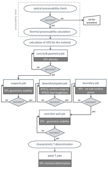 The present method, which is developed to assess the proper parameters for processing a new alloy grade by L-PBF independent of the fabrication appliance in use and of the chemical composition of the feedstock powder, implies a multistep approach, including the following: general evaluation of the processability of the new material and investigation of core bulk geometry, supports, downskin/upskin, boundary, thin wall, and plate temperature. For each step, the method describes what parameters should be considered, what key performance indicators (KPIs) should be optimized, what geometry should be tested, and what measurement methods should be applied. Each point is the subject for a dedicated section in the following presentation, but a comprehensive outline is provided as a road map in Figure 1.