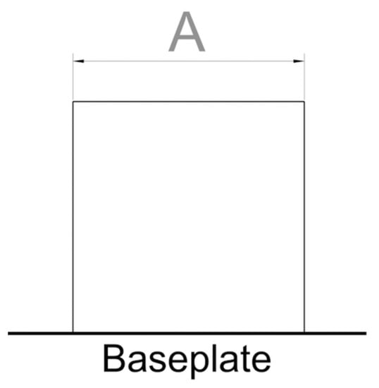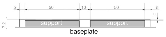 The same geometry shown in Figure 7 must be built in all jobs. Support structures must be placed only where specified in Figure 7, whereas the middle thick volume and two peripheral ones must be directly welded to the baseplate. The distance F in Figure 7 is an arbitrary value ranging from 1.2 mm to 4 mm. However, it is worth mentioning that stronger deformations are expected for greater F values. As a consequence, relatively low values of F should be preferred for those alloys that exhibit high shrinkage, and vice versa.