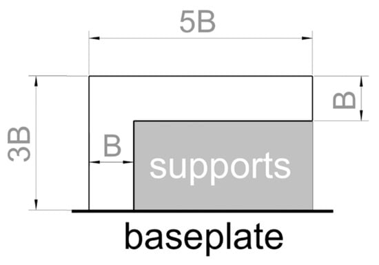 The recommended L-shaped geometry for assessing the support parameters is shown in Figure 3, where B is approximately twice as much as the XY grid dimension of the block supports, where XY is the plane of powder deposition. B is also the thickness of the sample. If the geometry in Figure 3 is actually adopted to assess the support parameters, the supports must be generated on the indicated surface.