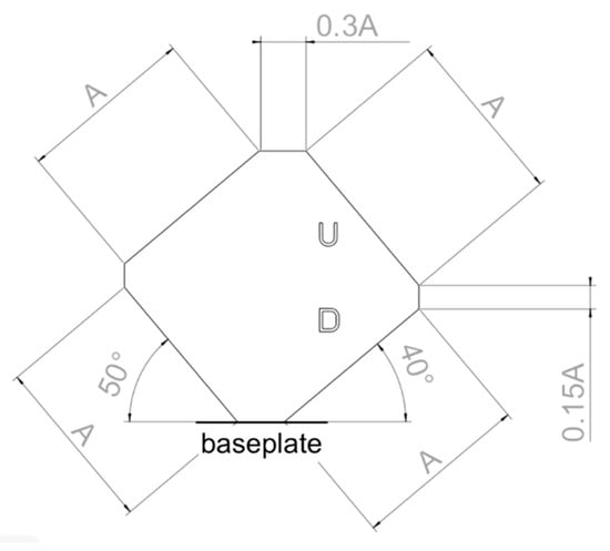 The geometry to be used in this job, as shown in Figure 5, is meant to emphasize the effect of the boundary parameters in down-facing angled surfaces, vertical surfaces, and up-facing angled surfaces, which are labelled in Figure 5 as DF, V, and UF, respectively. It is worth noting that, for the typical values of self-supporting angles in metal L-PBF, the DF surface in Figure 5 has been designed to represent an extreme condition. In this geometry, the dimension for D should be fixed in such a way that the roughness can be easily measured. The same D value can be applied to the depth of the specimen, too.