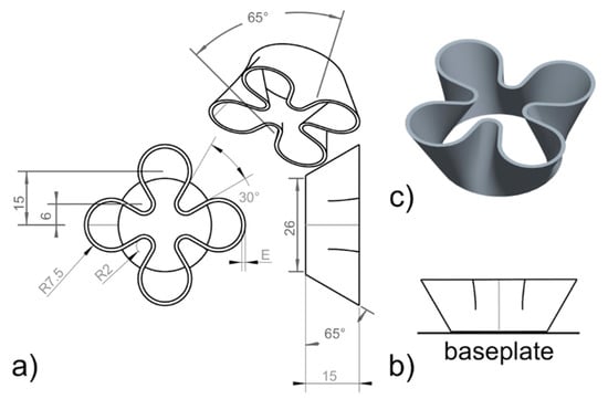 The reference geometry in Figure 6 has been specifically designed for the purpose. E is the wall thickness of the specimen, and its value depends on the thermal processability of the material. As a general guideline, a wall thickness E of 0.8 mm can be assumed for materials with TP at least in the range of 600 (W·m−1·K−1). Otherwise, E should not be less than 1.2 mm.