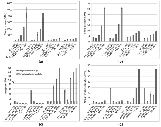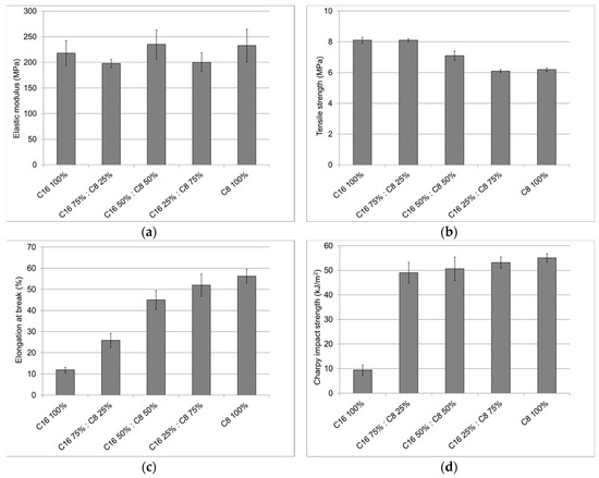 Mechanical properties of injection-molded cellulose C8 and C16 ester samples and their mixed blends: (a) Elastic modulus; (b) tensile strength; (c) elongation at break; (d) Charpy impact strength.