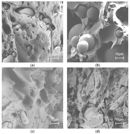 SEM images of blends at 1000× magnification (scale bar = 10 µm): (a) Cellulose C16/PLA 75%:25%; (b) cellulose C8/PLA 75%:25%; (c) cellulose C16/PLA 50%:50%; (d) cellulose C8/PLA 50%:50%.