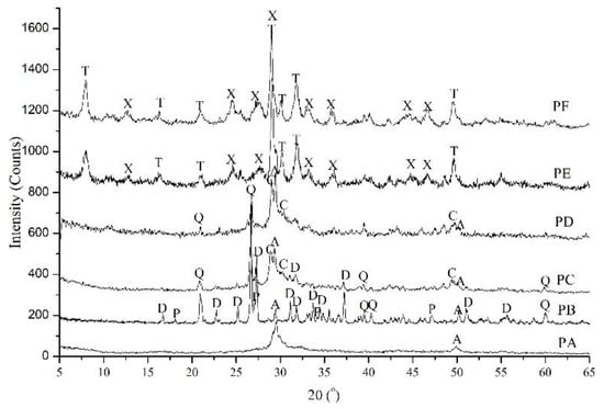 XRD patterns of calcium silicate hydrate powders (PA to PF) with the hydrothermal curing parameters in Table 1. A: Amorphous nature of C-S-H; C: CSH(I); D: α-C2SH; Q: α-SiO2; P: Ca(OH)2; T: Tobermorite; X: Xonotlite.
