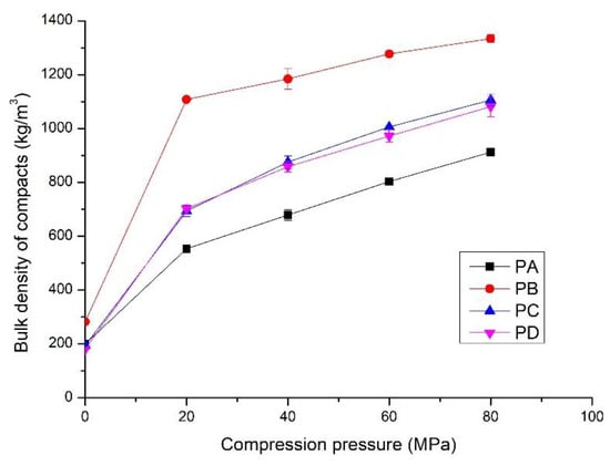 Bulk density of the compacts prepared from PA, PB, PC and PD at different compression pressures; hydrothermal synthesis of the powders shown in Table 1.