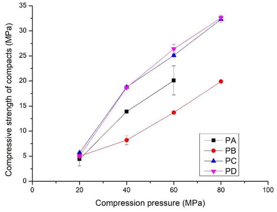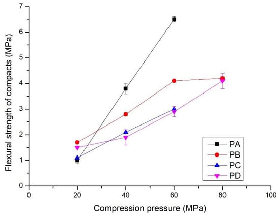 The compressive strength and flexural strength of the compacts increased linearly with compression pressures from 20 to 80 MPa (Figure 5 and Figure 6). Compressive strength varied from 5 to 35 MPa, and the flexural strength increased to 6.5 MPa. Interestingly, the development of strength with the compression pressure differs from that of the bulk density. The compacts made from PB exhibited the lowest compressive strength, from 5 to 20 MPa, although they had the highest bulk density. The compacts compressed from PC and PD showed the highest compressive strength, i.e., from 5.0 to 32.5 MPa. In contrast to the compressive strength, the compacts of PA showed rapid development of the flexural strength (Figure 6). It increased to 6.5 MPa from 1.0 MPa when the compression pressure increased from 20 MPa to. Compacts made from PC and PD had the lowest flexural strength, i.e., from 1.5 to 4.1 MPa. This indicates that the properties of the powders affect the mechanical properties of the compacts. Details are presented in the discussion section.