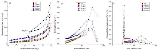 Pore structure of compacts compressed from PA at different compression pressures (20–80 MPa): (a) isothermal linear plots; (b) pore size distribution based on BJH adsorption isothermal; (c) pore size distribution based on BJH desorption isothermal.