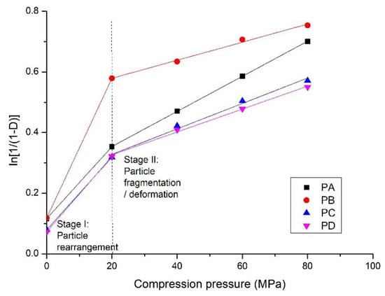 The values of constants a and b from Equations (1) and (2) shown in Table 4 indicate the compaction properties of the powders. The slope k reflects the plasticity and 1/k, known as the yield pressure, is associated with particle deformation. A higher slope (k) indicates higher plastic deformation [31,38]. The constant a represents the particle movement at low pressures before interparticulate bonding occurs, and b denotes that the powders have a certain densification by individual particle movement in Stage I, with a higher value for higher compressibility [39]. PA has the highest plastic deformation, which is attributed to the amorphous C-S-H, and PB is the most compressible material in this study because of the lowest specific surface area and the presence of crystalline phases. The potential for the compaction process depends on the nature of the powders, including their phases.