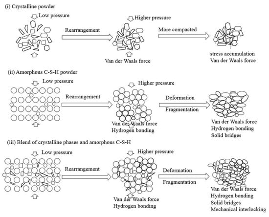 The microstructure analysis and mechanical properties of the compacts show that the powders with amorphous C-S-H have contact-hardening properties. Crystalline calcium silicate hydrate and α-SiO2 powders are difficult to compact and/or harden, as shown in Table 2. This suggests that amorphous C-S-H plays a key role in producing strong bonds during compression for developing the strength of the compacts. Stemmermann et al. [13] considered the ionic bond as a predominant factor in strength development. Glukhovsky [16] assumed that the bond formed by point contact of particles greatly improves the strength of compacts. In this section, different bonding patterns during compaction that are related to the properties of amorphous and crystalline C-S-H are discussed and are shown in the schematic diagram in Figure 10.
