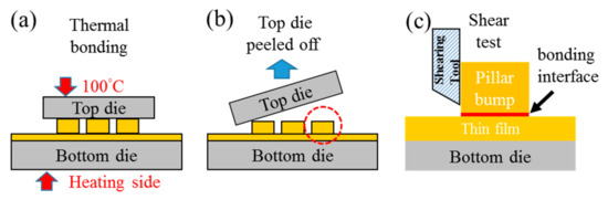 The schematic drawings show the experimental procedures. (a) Cu-to-Cu direct bonding, (b) top die peeled off, and (c) shear tests of Cu joint.