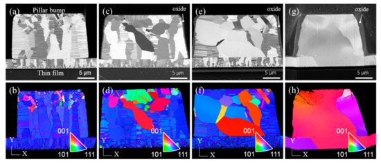 Bonding between the Cu pillar bumps and the Cu films was achieved at a temperature gradient ranging from 200 °C/100 °C to 350 °C/100 °C in N2 ambient. Figure 2 presents the cross-sectional FIB and EBSD images for nt-Cu pillar bumps bonded to nt-Cu films. After bonding at a temperature condition of 200 °C/100 °C for 20 min, most of the nanotwinned columnar grains remained in the pillar bump and the Cu film, as shown in Figure 2a. Figure 2b shows the corresponding orientation map (OIM) and the pole figure, where the columnar grains were (111)-oriented. For the Cu joints bonded at 250 °C/100 °C, recrystallization and grain growth phenomena were observed, as shown in Figure 2c. Some of the nanotwinned grains disappeared and several grains, without nanotwins, grew in the Cu pillar bump near the Si substrate side. The new grains were <100>- and <110>-oriented, as presented in the cross-sectional OIM images in Figure 2d. Furthermore, grain growth was not found across the bonding interface, or in the Cu film. As the bonding temperature increased to 300 °C/100 °C, more columnar grains in the pillar bump were consumed by other grains, as depicted in Figure 1e,f. Extensive grain growth took place at 350 °C, as illustrated in Figure 2g,h. Large grains grew from the pillar bump to consume the (111) columnar grains in the Cu film. The orientations of the large grains were <100> and <211>, as shown in Figure 2h. It is noteworthy to point out that a thick oxide layer formed on the side wall of the Cu pillar bump after the bonding process at 350 °C, as labeled in Figure 2g.