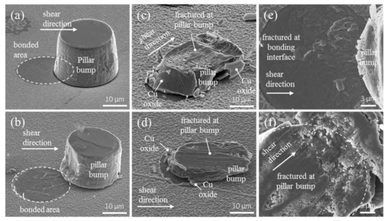 The fracture modes were examined by SEM images. For Cu joints bonded at 200 °C/100 °C, the Cu pillar bump was shifted under the shear, and the fracture occurred at the bonding interface in a brittle manner, as shown in Figure 5a. In addition, there was almost no plastic deformation in the fracture interface. For the Cu joints bonded at 250 °C, a similar fracture mode was observed, as depicted in Figure 5b. Plastic deformation was also present in the pillar bumps and in the fracture interface. Conversely, as the bonding temperature increased to 300 °C/100 °C and 350 °C/100 °C, the fracture mode became ductile, and the fracture took place in the Cu pillar bumps, as seen in Figure 5c,d. The Cu oxides on the side walls of the Cu pillar bump delaminated from the bump, as indicated by some of the arrows in Figure 5c,d. Figure 5e shows the enlarged plan-view SEM image for a brittle failure surface for the Cu pillar bump bonded at 250 °C, whereas Figure 5f presents the enlarged top-view SEM image for the fracture surface in Figure 5c. Plastic deformation took place in the Cu pillar bump. Therefore, it is ductile fracture for the Cu direct bumps bonded at temperature above 300 °C.