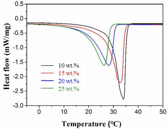 Figure 2 shows the DSC curves of the CaCl2∙6H2O-MgCl2∙6H2O eutectic mixtures with different mass fractions of MgCl2·6H2O; the details are listed in Table 1. The increase in the mass fraction of MgCl2·6H2O leads to a decrease in the melting point and specific phase change enthalpy. Note that the suitable phase change temperature of the PCM applied into the walls of buildings has to be between 22 °C and 26 °C. Moreover, the peak temperature of the mixture containing 15% of MgCl2·6H2O is lower than that of the one containing 10%. Therefore, the mixture containing 15% of MgCl2·6H2O was selected as a suitable PCM for use in buildings, exhibiting a latent heat value of 151.9 kJ/kg.