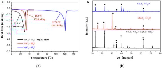 (a) DSC curves and (b) XRD patterns of the CaCl2∙6H2O sample, MgCl2∙6H2O, and CaCl2∙6H2O-MgCl2∙6H2O.
