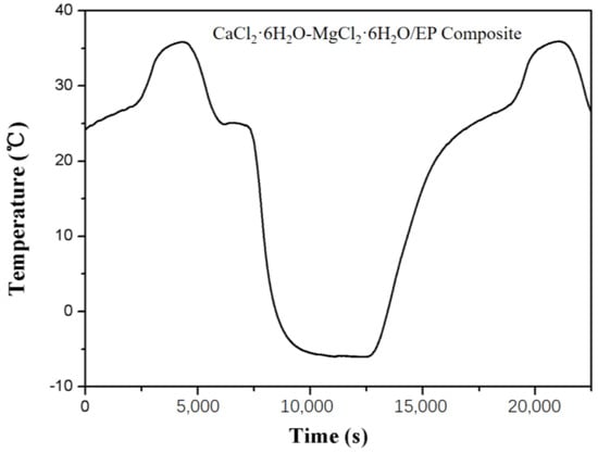 The X-ray diffractometer (XRD, D8-ADVANCE, Bruker, Billerica, MA, USA, Cu Kα radiation λ = 1.5406 Å) collected the diffraction patterns of CaCl2∙6H2O, MgCl2∙6H2O, and the eutectics in the 2θ ranging from 5° to 80°. The FT-IR of the pristine salts and the composite PCMs whose wavenumber ranged from 4000–400 cm−1 were obtained with the spectrophotometer (Tensor 27, Bruker, Billerica, MA, USA) at room temperature. The microstructures of EP and the CaCl2∙6H2O-MgCl2∙6H2O/EP composite PCM were observed using a scanning electron microscope (SEM, Quanta, FEI, Hillsboro, OR, USA).