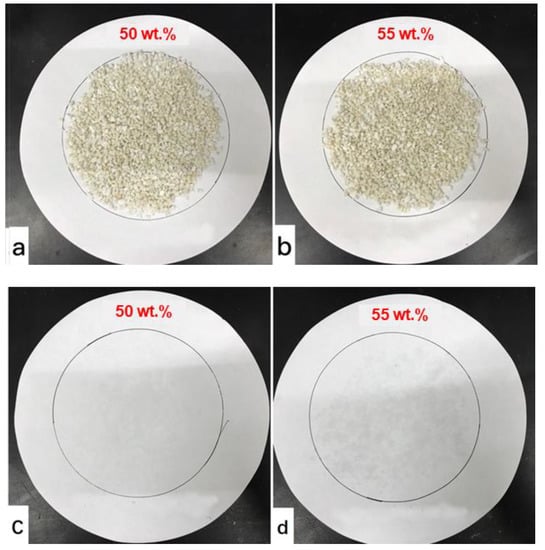 The disadvantages of phase separation and liquid leakage for the eutectic mixture have been overcome by combining it with EP to prepare a composite PCM. In order to determine the adsorptive capacity of EP for the eutectic mixture, the liquid leakage tests have been conducted to the four composites containing different mass fractions of the eutectic. As shown in Figure 5, the composite containing 50% of the eutectic exhibits no liquid leakage, while some leakage is found on the filter of the one with PCM mass fraction of 55%. Therefore, the suitable mass fraction of the eutectic PCM adsorbed into EP is determined to be around 50%, and the corresponding sample is thus taken as the CaCl2∙6H2O-MgCl2∙6H2O/EP composite PCM.