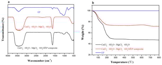 FT-IR spectra (a) and TG curves (b) of EP, the CaCl2∙6H2O-MgCl2∙6H2O eutectic mixture, and the CaCl2∙6H2O-MgCl2∙6H2O/EP composite PCM.