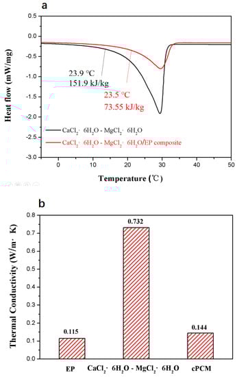 Figure 8a shows the DSC curve of the composite PCM, along with that of the CaCl2∙6H2O-MgCl2∙6H2O mixture for comparison. The melting point of the composite PCM is 23.5 °C, very close to the CaCl2∙6H2O-MgCl2∙6H2O mixture, suggesting that the composite PCM can be applied into the walls of buildings for energy conversation. The specific phase change enthalpy of the composite PCM is 73.55 J/g, which agrees with the eutectic mass fraction in the composite PCM. Thanks to the low thermal conductivity of the EP, the thermal conductivity of the composite PCM is far lower than that of the eutectic, as shown in Figure 8b. Both the relatively high specific phase change enthalpy and the thermal conductivity guarantees that the composite PCM is suitable for use in energy-saving efforts for buildings.