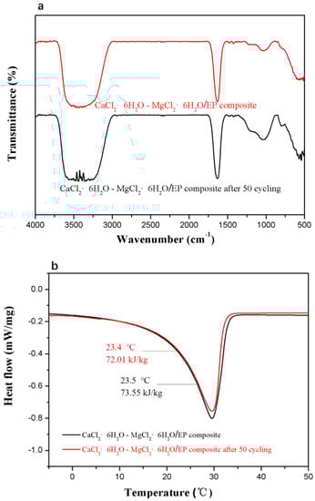 FT-IR spectra (a) and DSC curves (b) of the CaCl2∙6H2O-MgCl2∙6H2O/EP composite PCM that experiences (or does not) the heating-cooling cycling test.