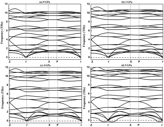 The phonon characteristics directly reflect dynamic stability and play a vital role in the physical properties of materials. We now turn to the vibrational properties of chalcopyrite-type compound AgGaS2. Figure 2 exhibits the computational phonon spectrums along the high symmetry line Z(1/2,1/2,−1/2)→Γ(0,0,0)→X(0,0,1/2)→P(1/4,1/4,1/4)→Γ(0,0,0) in the first Brillouin zone at different pressures.